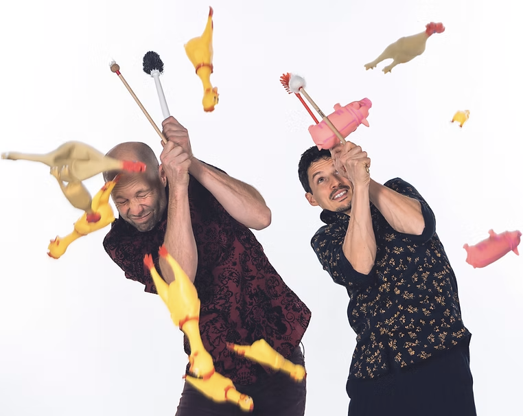BUBBLE BEATZ schlagZEUGS Bubble Beatz sind mit «schlagZEUGS» zurück auf der Bühne. Die Bubble Beatz sind wieder da. Christian Gschwend und Kay Rauber können es nicht lassen und haben für ihr neues Programm «schlagZEUGS» alltägliche Dinge zusammengetragen, auf denen sie wieder den Rhythmus angeben. Damit kehren Bubble Beatz zu ihren Anfängen zurück. Klein und fein ist wieder alles geworden. Aufs Nötigste reduziert und maximal kreativ. Voller Energie und Einfallsreichtum. Sie spielen auf Töpfen, Kesseln, mit Stöcken, Schwingbesen und manchmal auch mit Gummihühnern. Noch vor wenigen Jahren waren Bubble Beatz mit ganzen Baugerüsten, verbeulten Regentonnen und massiven Schrottteilen unterwegs. Gschwend und Rauber spielten ihre Rhythmus-Show in grossen Hallen und bis nach China. Dann machten sie auf unbestimmte Zeit Pause und sind nun zurück. Sie nehmen es gemütlicher und laden ihr Publikum mit «schlagZEUGS» mitunter auch in gediegene Theatersäle. «Jede Band geht einmal auf unplugged Tour», meinen die Bubbles und haben ihr Bühnen-Tenue also von ‘verschwitzt’ auf ‘hemdsärmelig’ umgestellt. Ihre Show hingegen ist gewohnt rhythmisch und satt. Gschwend ist der Quirlige, Rauber der Seriöse mit leichtem Hang zum Skurrilen. Gemeinsam trommeln sie auf allem, was ihnen unter die Stöcke kommt und testen etliche Alltagsgegenstände auf ihre Klang- und Rhythmus-tauglichkeit. Da staunt ihr Publikum, dass man auf einem Eierschneider einen orientalischen Popsong und auf einer Schnur aus einer Holzkiste ‘Stand by me’ intonieren kann. Samba, Techno, Rockgroove, bei den Bubbles kommt alles leichtfüssig und verspielt daher. Fast vergisst man bei all diesen so locker vorgetragenen Nummern, dass zwei Musiker am Werk sind, die ihr Handwerk vorzüglich beherrschen. Und das seit mehr als 20 Jahren.