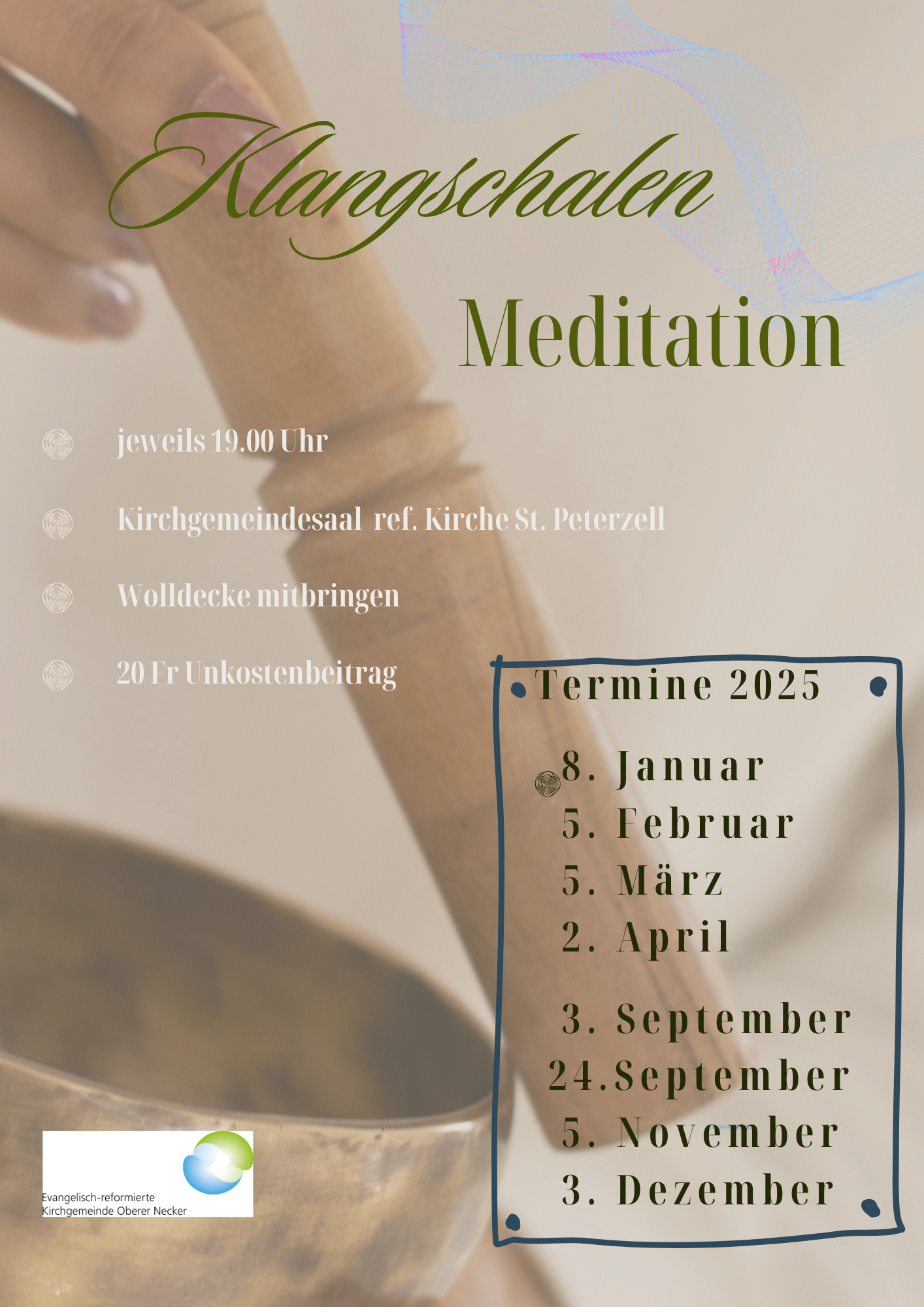 Nina Sarila führt durch eine Klangschalenmeditation. Anschliessend wird zum Tee eingeladen. Bitte eine Unterlage zum Liegen und eine Decke sowie gemütliche Kleidung mitbringen. Wir bitten die Teilnehmenden um einen Unkostenbeitrag von 20 Franken.