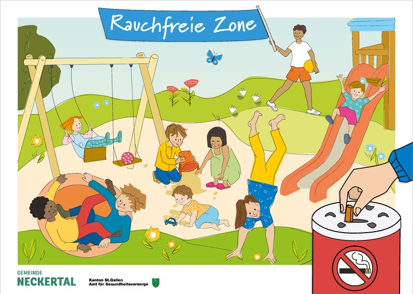 Als kinder- und familienfreundliche Gemeinde liegt dem Gemeinderat und der Verwaltung das Wohl der Kinder besonders am Herzen. Gemeinsam mit dem Gesundheitsdepartement des Kantons St.Gallen wurde nun ein Projekt für das gesunde Aufwachsen von Kindern realisiert. Zum Schutz vor Passivrauchen und zur Verminderung der Gefahr durch herumliegende Zigarettenstummel werden die Spielplätze der Gemeinde Neckertal neu rauchfrei.