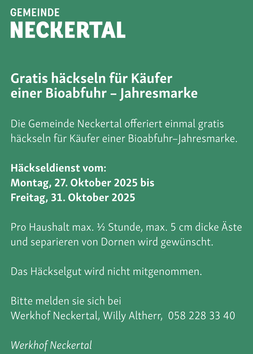 Die Gemeinde Neckertal offeriert einmal pro Jahr gratis häckseln für Käufer einer Bioabfuhr-Jahresmarke.